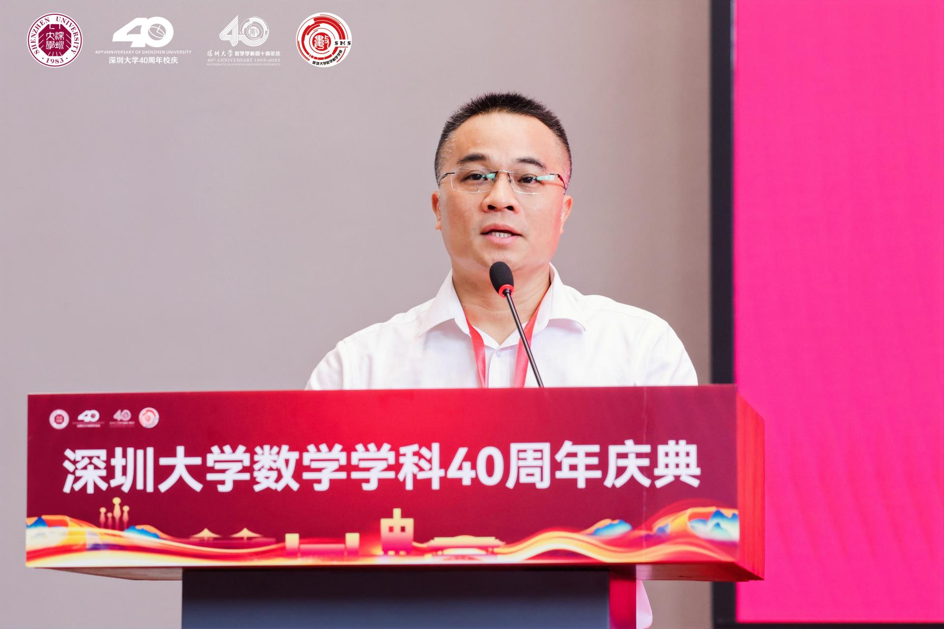 Prof. Wang Qiru delivered a speech on behalf of Guangdong Society of Industrial and Applied Mathematics. He said that the Mathematics Discipline of SZU has given great support to the Guangdong Society of Industrial and Applied Mathematics and achieved excellent results in various competitions. He expressed his blessings to the 40th anniversary of the Mathematics Discipline of SZU and hoped that we could work together to strengthen cooperation and achieve even better results in the future.