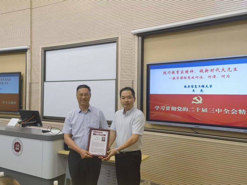 On the afternoon of June 19th, the fifteenth session of the "Li Yuan Masters Forum" hosted by the School of Mathematical Sciences commenced in Classroom 1, Convergence Stars Building, Yuehai Campus. The lecture was titled: Promoting the Spirit of Educators, Becoming a 'Great Master' of the New Era: The Position, Meaning, and Practice of Ideological and Political Education in Mathematics Courses. Professor Wang Yao, former Executive Vice President (President-level) of Nanjing University of Information Science and Technology, Level-2 Professor, and Doctoral Supervisor, served as the keynote speaker. He delivered an insightful report on curriculum-based ideological and political education for the faculty. The lecture was presided over by the Dean of the School, who also presented Professor Wang Yao with a commemorative plaque.