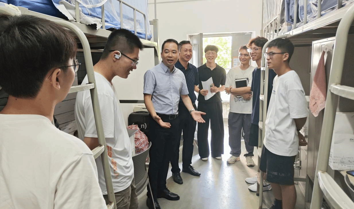 At the same time, Dean and Party Secretary Wang Yu, accompanied by Deputy Secretary Ye Xing and counselors, visited the dormitories to meet the freshmen. The Dean kindly inquired about their accommodations, where they came from, and how they were adapting to university life and their new living environment. The Dean reminded everyone to plan their time in advance, to prioritize learning as the central task of university, and to take professional courses seriously, setting further academic advancement as their goal. In addition, the Dean and Secretary encouraged students to pay attention to their health, strengthen physical exercise, and develop good living habits. The accompanying counselors also engaged warmly with the freshmen, introducing important matters of study and daily life while patiently addressing their questions. The atmosphere was filled with warmth and care, making the new students feel truly welcomed.