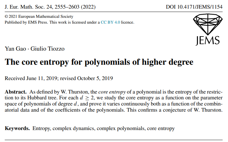 数学与统计学院副教授高延与多伦多大学Tiozzo教授合作的学术论文“The core entropy for polynomials of higher degree”。