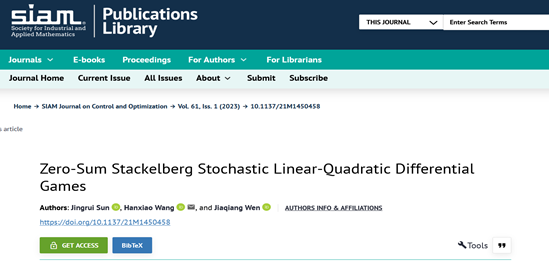 数学与统计学院助理教授王寒霄与南方科技大学助理教授孙景瑞、温家强合作的学术论文“Zero-SumStackelberg Stochastic Linear-Quadratic Differential Games”。