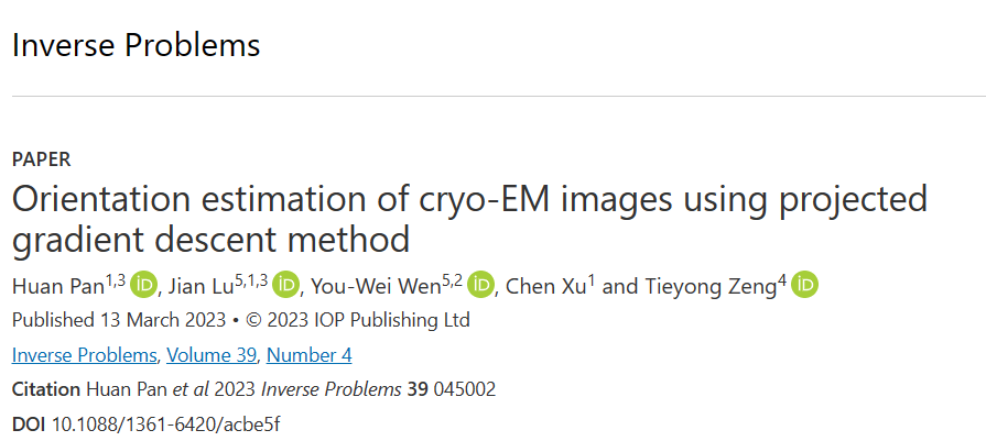 数学与统计学院数学与智能信息处理团队潘欢博士后、鲁坚教授、徐晨教授与湖南师范大学文有为教授、香港中文大学曾铁勇教授合作的学术论文“Orientation Estimation of Cryo-EM Images using ProjectedGradient Descent Method”。