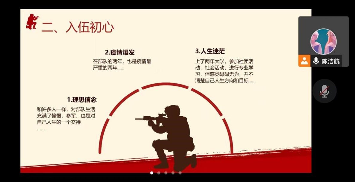 退伍学生陈洁航同学作“热血北疆,英雄屹立”部队经历主题分享。陈同学于2021年3月正式入伍。两年的军旅生活给陈洁航留下了难忘而深刻的记忆,讲到入伍的初心,她认为坚定的理想信念和深厚的家国情怀是她坚定入伍决心的重要因素,陈洁航毅然决定去部队磨炼意志。谈及入伍两年的感受,陈洁航打趣道“都说当兵后悔两年,不当兵后悔一辈子,但当你真正深入军营,两年的入伍生活也绝对不会后悔,深厚的战友情,宝贵的部队经历,坚韧磨砺的品质都将成为你之后人生的前进的力量”。最后,陈洁航同学呼吁有意愿入伍的同学把握机会,将在校园所学的知识带到军营,奉献军营,把个人命运与中华民族伟大复兴相结合,实现人生价值。
