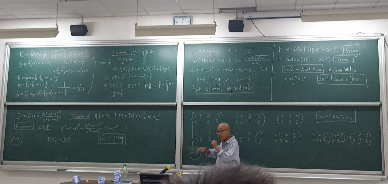 讲座中,余教授从简单的运算开始,介绍了数学中“群”的概念,并由“群”的概念不断深入,用通俗易懂的语言向同学们介绍了更多相关的知识以及这些知识在生活中的体现和实际应用。除此之外余教授还以数学知识为依托,介绍了一些与这些数学发展相关的数学家以及背后的故事,让同学们感受到了来自数学的魅力。