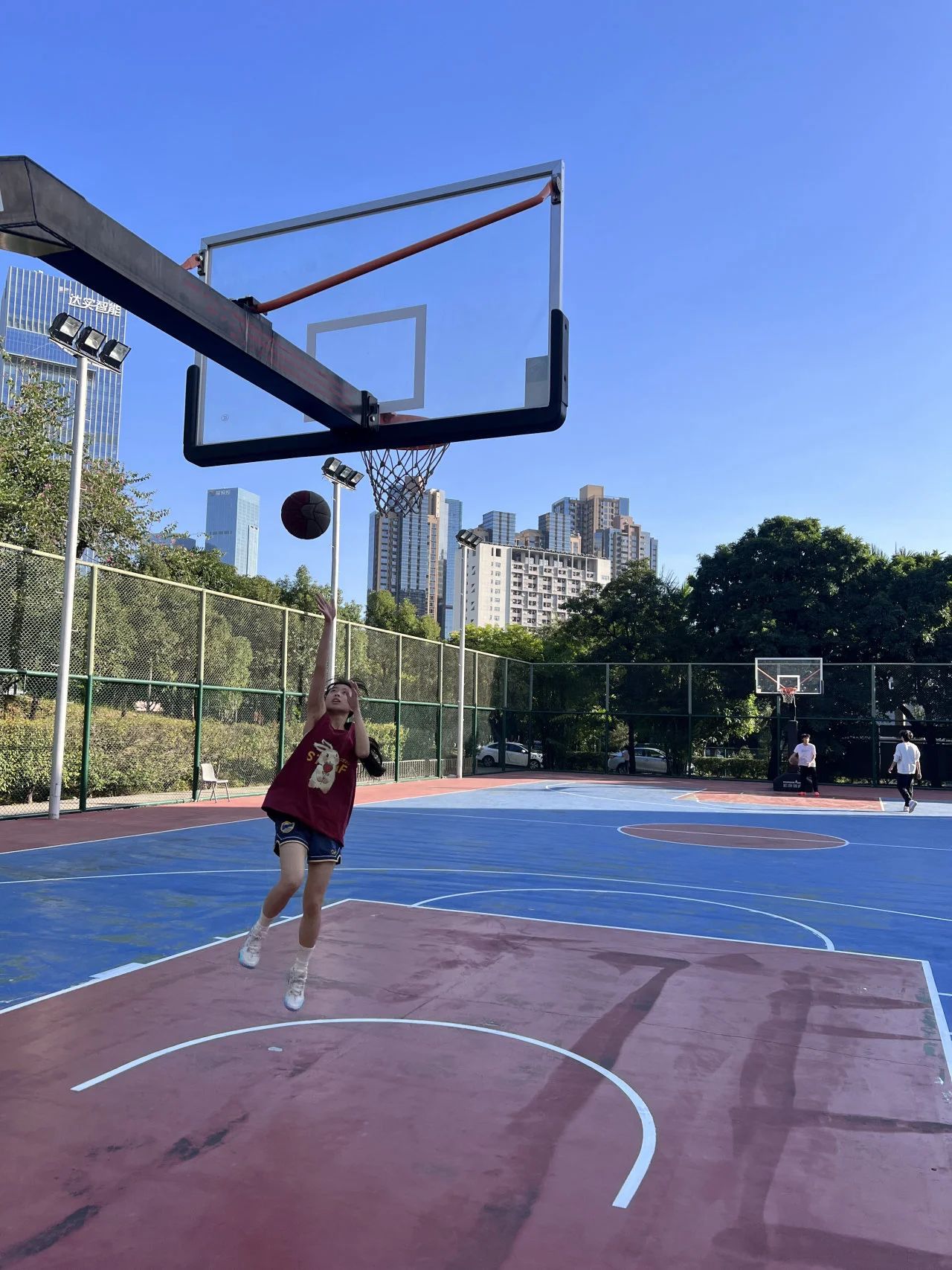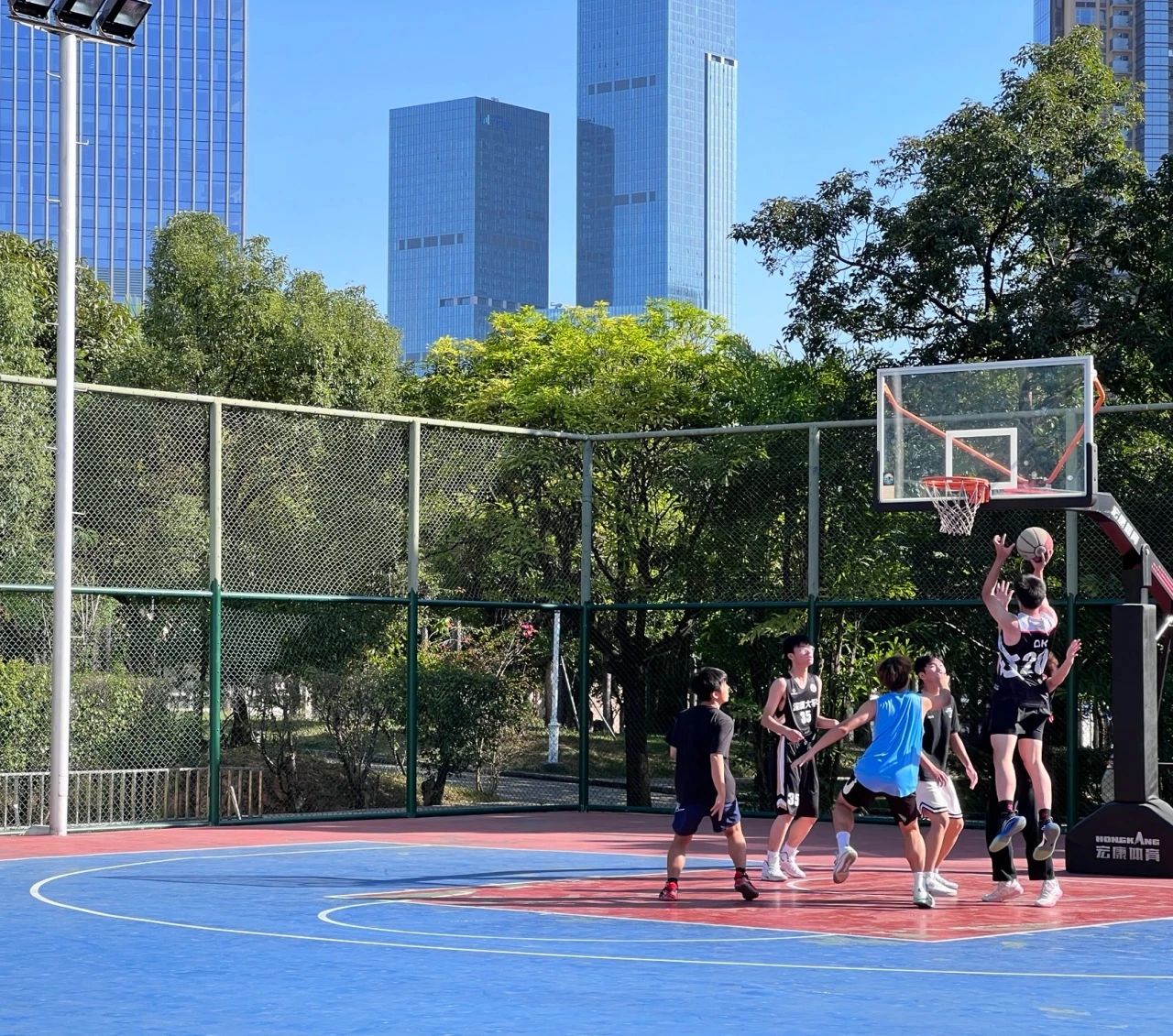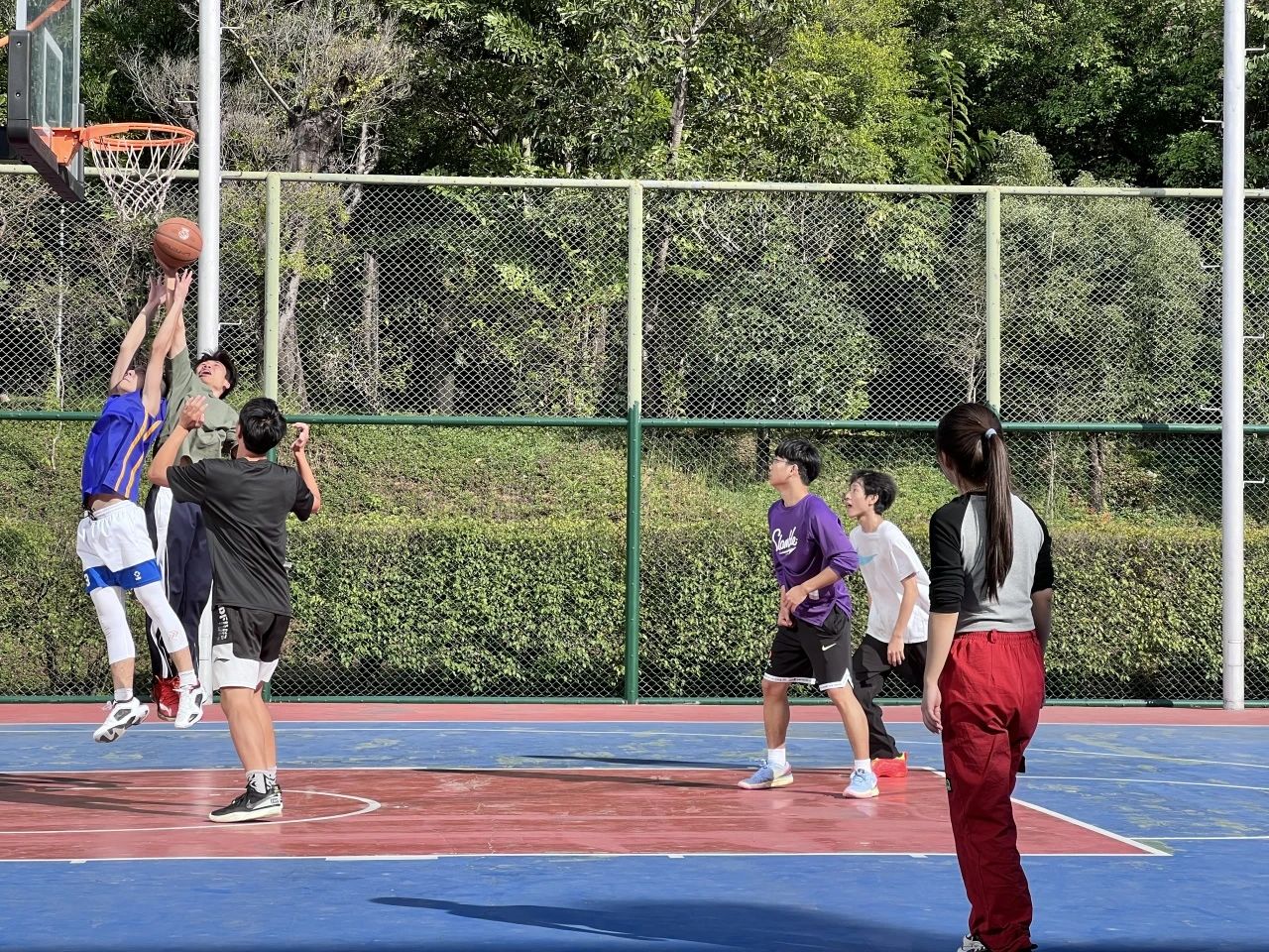 男子篮球赛在两个半场火热进行,每支队伍都斗志满满,即使顶着烈日,仍不失打球热情。传球、接球、过人、上篮、抢篮板等动作一气呵成,在球场上留下肆意飞扬的身影。