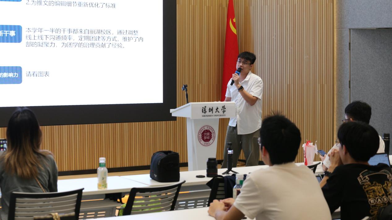 双创部总干事梁海湖分享了近一年在团学中的所行所感。在过去的团学工作中,他参与负责了数学竞赛报名整理、数学文化月举办、荔园挑战等一系列工作中,全面了解团学工作,全面提升了自我。他毫不掩饰地表示,自己在细节方面的能力有待提升。对于团学未来展望,他提出以下三点:增强团学内部凝聚力、扩大团学活动宣传力、提升主席团与总干事执行力。