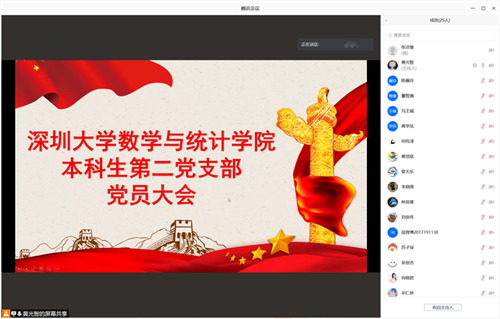 12月19日,数学与统计学院本科生第二党支部召开线上支部大会,组织集中观看大型电视纪录片《为了和平》。党支部书记肖晓君老师,支部委员黄光智、张洁愉及第二党支部全体党员(含预备党员)参加会议,本次会议由组织委员黄光智主持。