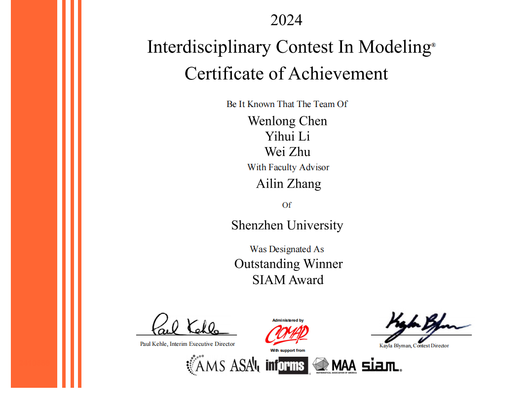 张爱林老师指导的竞赛团队从全球2.8万支大学生队伍中脱颖而出,不仅荣获了该竞赛的最高荣誉——Outstanding奖(简称O奖,获奖率为0.0012),还斩获了美国工业与应用数学学会(SIAM)颁发的SIAM冠名奖。