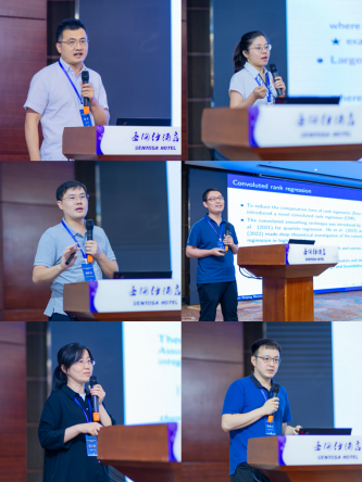 5月25日下午的学术报告分别由中国科学院地质与地球物理研究所王彦飞教授、中国科学院大学韩丛英教授、曲阜师范大学王宜举教授和南京师范大学孙海琳教授主持。上海交通大学范金燕教授介绍了非线性最小二乘问题的无导数方法。上海交通大学何斯迈教授介绍了分布鲁棒优化理论进展与应用研究。其余青年学者们针对策略梯度方法的收敛性问题、大规模优化中随机化和稀疏性开发、量化三阶对称张量的低阶近似、高维复杂秩回归的统计推断、随机规划问题中的统计鲁棒性、波动市场中高维投资组合优化的有效方法进行了专题报告。报告人与参会人员围绕专题报告积极讨论、踊跃发言,极大地促进了参会人员之间的学术交流。