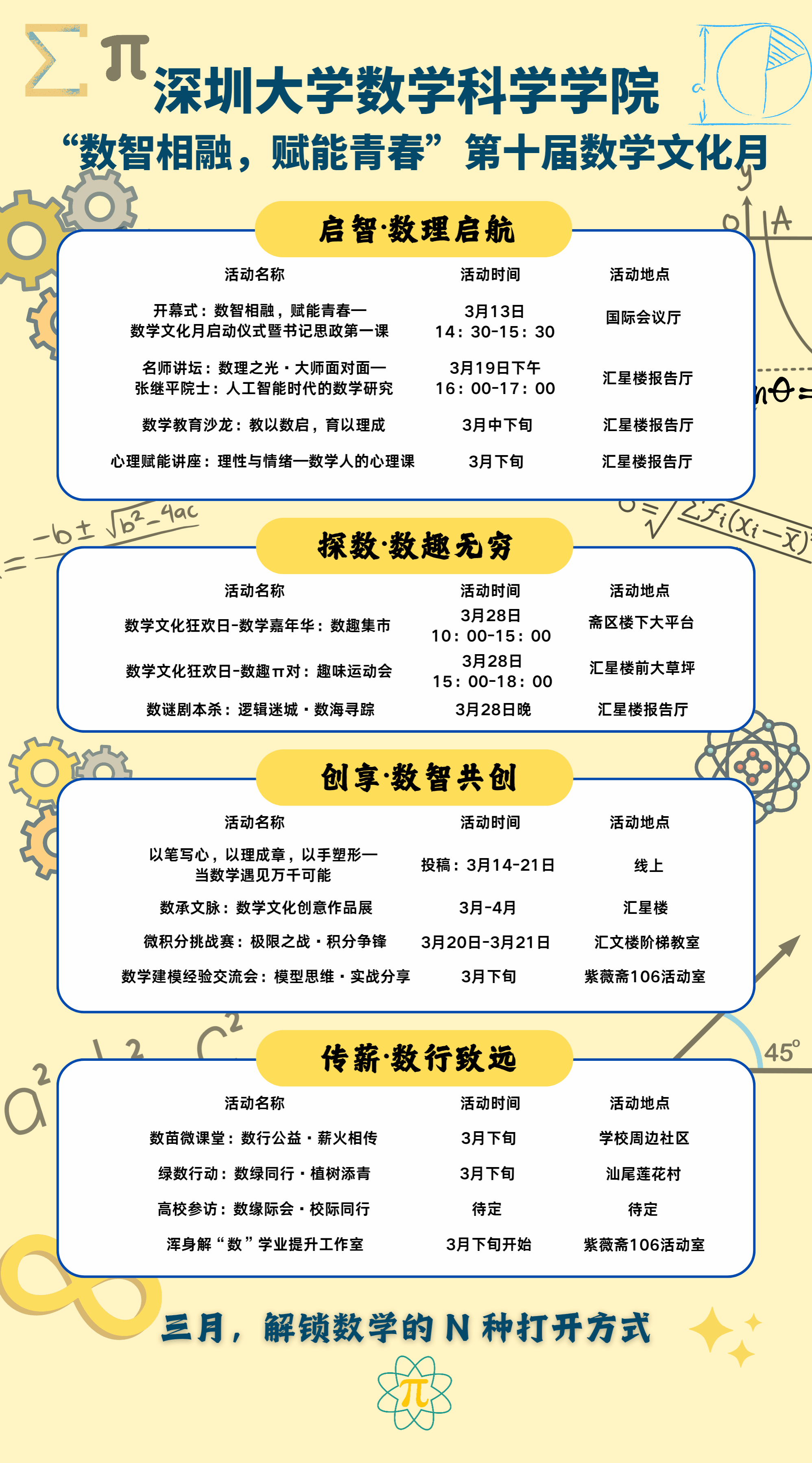 本次数学文化月将持续至4月,通过近20项形式多样、内容丰富的活动,全方位营造“钻研数学、分享数学、热爱数学”的浓厚氛围,并致力于打造融合专业知识与思政教育的特色品牌,引导广大师生在感受数学魅力的同时,传承数学家精神,勇担新时代使命。