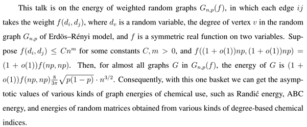 报告题目: The asymptotic value of graph energy for random graphs with degree-based weights