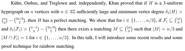 报告题目: Rainbow perfect matchings for 3-hypergraphs