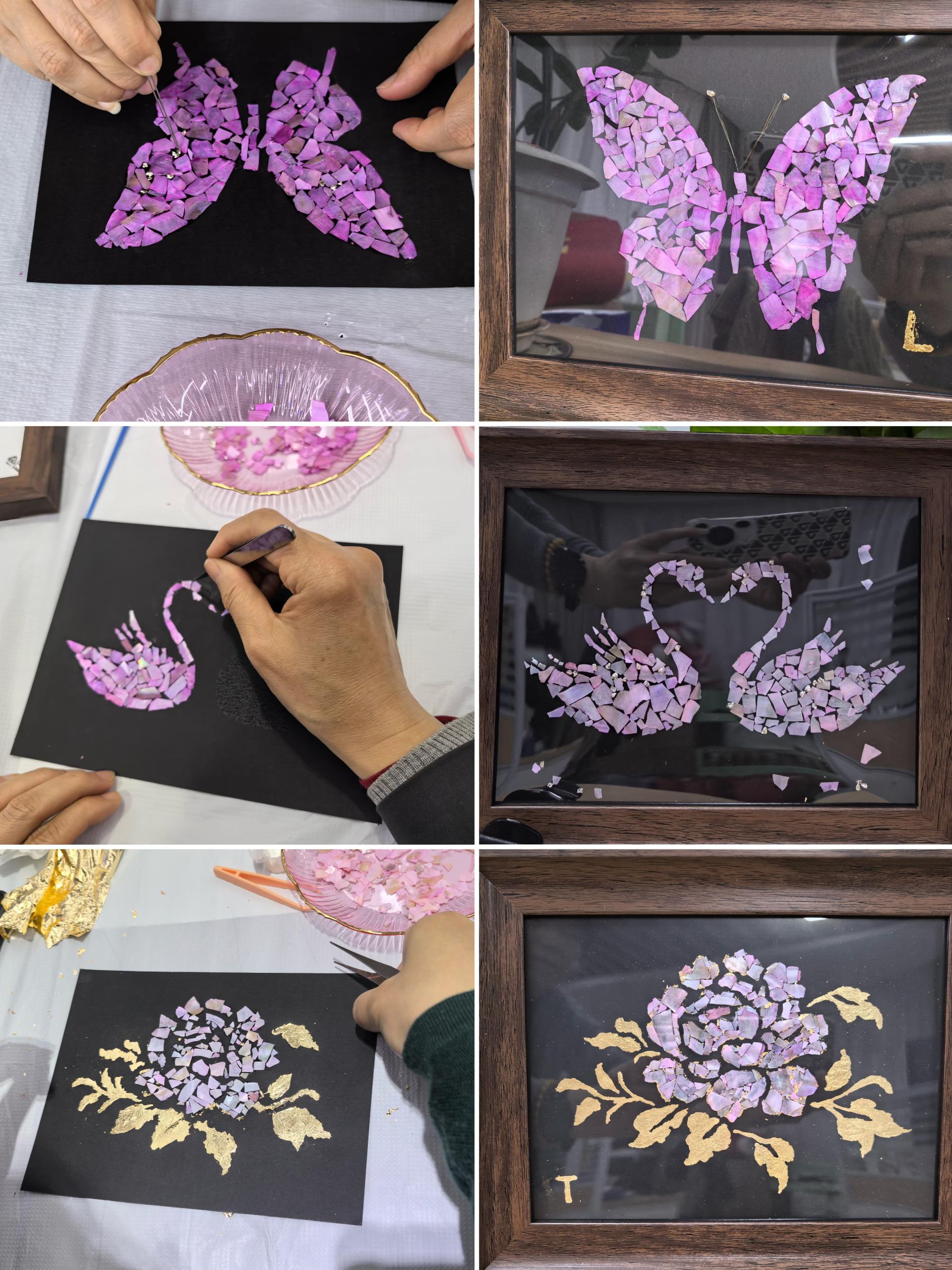 在手作体验环节,张乐老师带领大家走进螺钿艺术世界。她通过影像资料讲述螺钿画的发展历史,解析贝母挑选技巧,并示范"轻点慢压"的金箔粘贴要领。老师们以黑色卡纸为底,将彩色贝母与金箔等元素精心组合——牡丹舒展国色,天鹅曲颈优雅,蝶翼轻颤欲飞。活动现场惊叹连连,老师们或俯身细描纹路,或举镜记录创作,指尖跃动着数学人特有的严谨匠心与艺术浪漫。