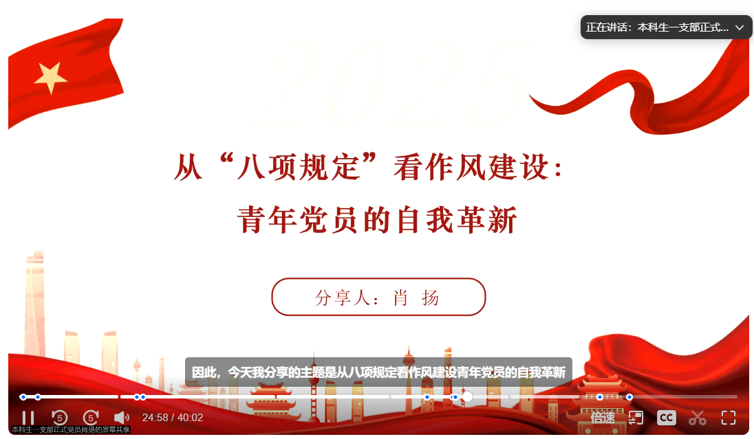 接着肖扬同志以“从八项规定看作风建设,青年党员的自我革新”为题,回顾了中央八项规定十年来的实践成效。通过数据与案例,他指出八项规定不仅重塑了党风政风,更与青年党员的日常行为息息相关。他呼吁学生党员从三方面践行中央八项规定精神:一是思想层面强化宗旨意识,警惕“躺平”心态;二是行动中严守学术诚信、践行节俭作风;三是创新校园实践,如推行“五学联动”机制、组织主题调研等。他总结道:“作风建设没有旁观席,青年党员应以刀刃向内的勇气,在点滴中锤炼党性,做新时代的合格答卷人。”