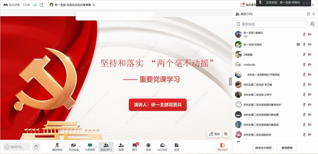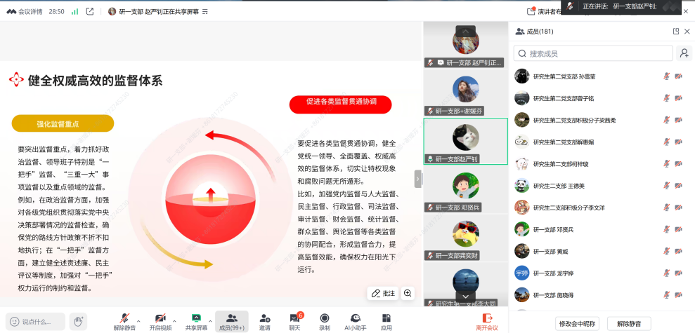 分党校组织四个学生党支部联合开展2025年第二次集中微党课,217名学生党员、发展对象、积极分子等通过腾讯会议参与。研究生第一党支部承办,龚奕财、邓贤兵、赵严钊主讲,分别围绕科技强国战略、“两个毫不动摇”政策、全面从严治党体系展开论述。